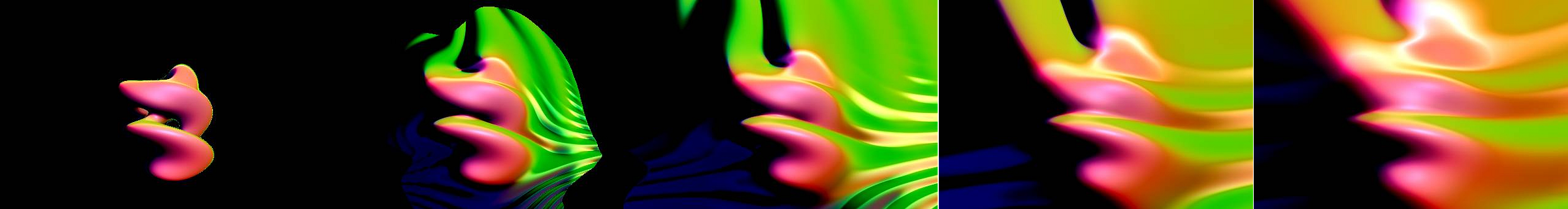 Experimenting with a shader rendering technique known as raymarching to evaluate the shape of signed distance function of a 3D object, I discovered a way to modify the typical algorithm that effectively “unwraps” the subject onto a infinitely stretched out canvas. When stretched out this way, the render effectively draws the shape from all angles while the light calculations remain preserved on the surface prior to unwrapping. What this means is you see both the light and shadow side of a three dimensional object. I chose a twisted torus for it’s intertwined segments and smooth surface because once unfolded, it renders beautiful bands of light and dark while producing smooth gradients.
