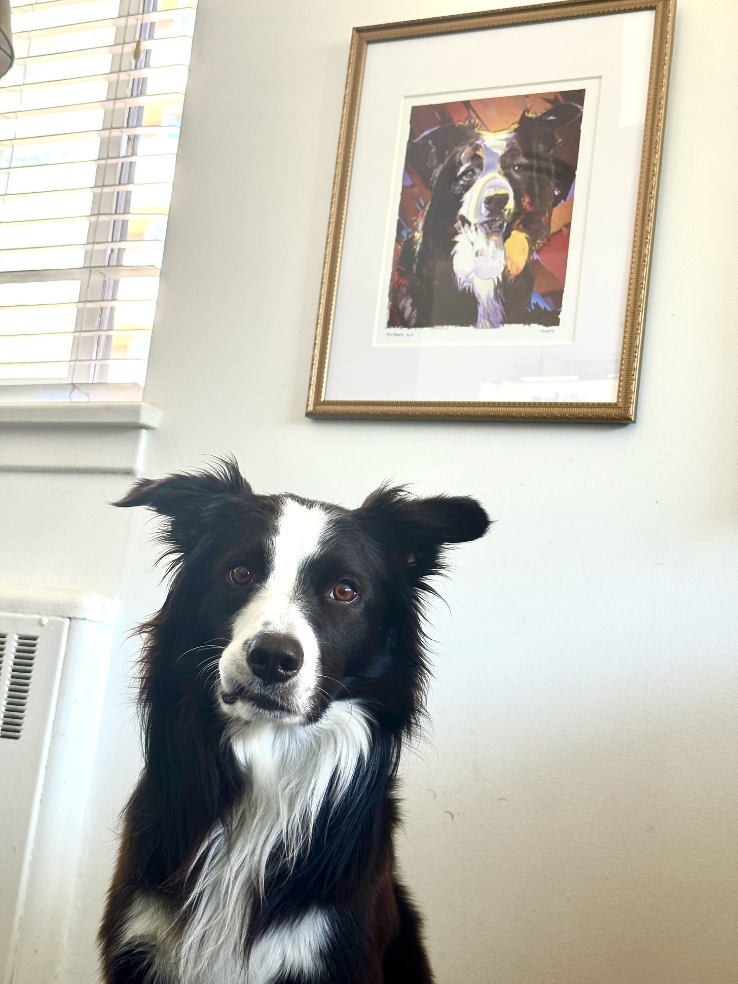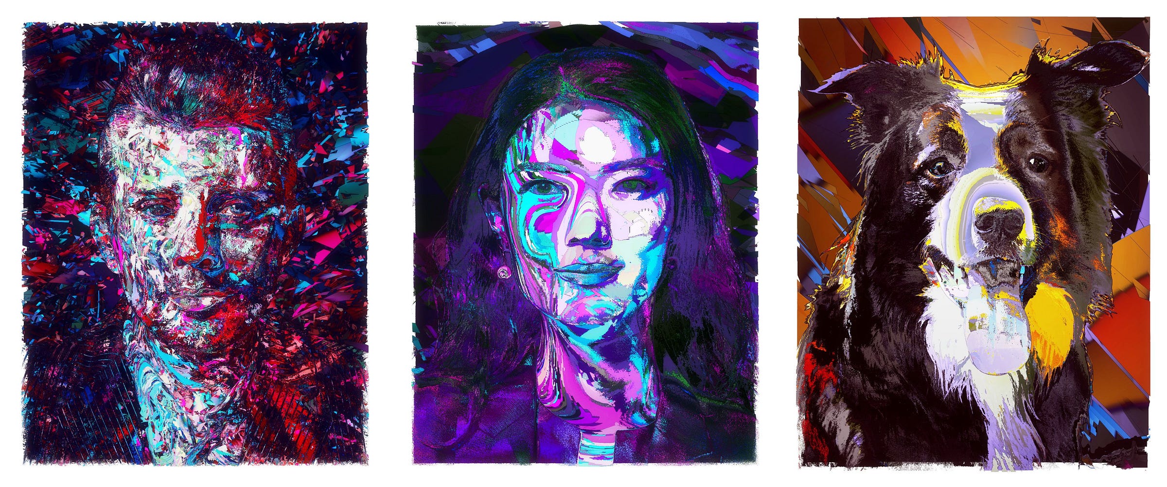 I chose a fragmented style for myself (left) because I felt it best represented the type of art I love creating. For my partner (middle), I chose something with a bit more flow and mystique so it would feel more feminine. And for our dog Pistachio (right) I went closer to realism than I normally would with my art because I wanted it to be visually readable as a cute portrait that we could hang above his bed. Not everything I make has to be serious fine art, right?