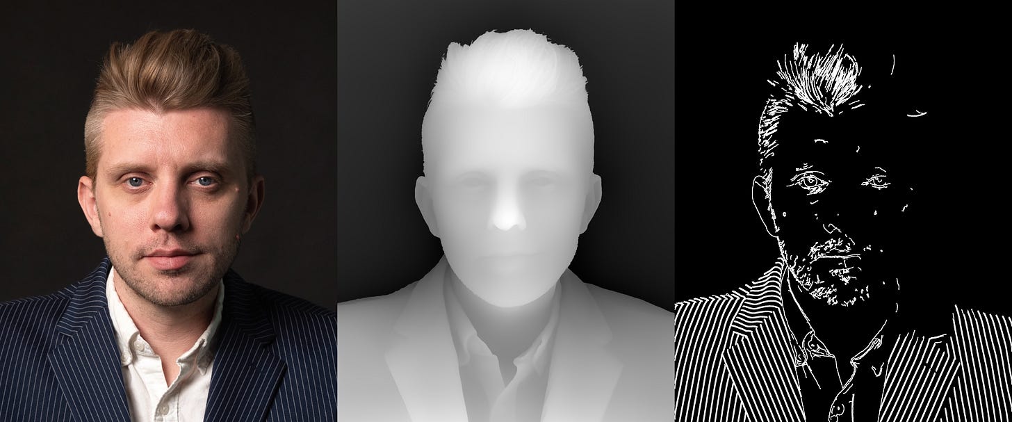 We live in a wonderful world of AI magic, and so I quickly discovered open source models for generating depth estimations. It didn’t take much to add edge detection and feature masks for my mouth and eyes. These masks were then used to modify my code, including: